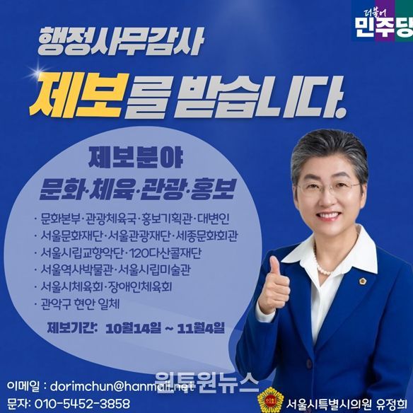 (원투원뉴스) 서울특별시의회 문화체육관광위원회 유정희 의원(더불어민주당, 관악4)은 10월 14일부터 11월 4일까지 시민 의견을 직접 접수받는 ‘행정사무감사 시민제보창구’를 운영한다고 밝혔다.