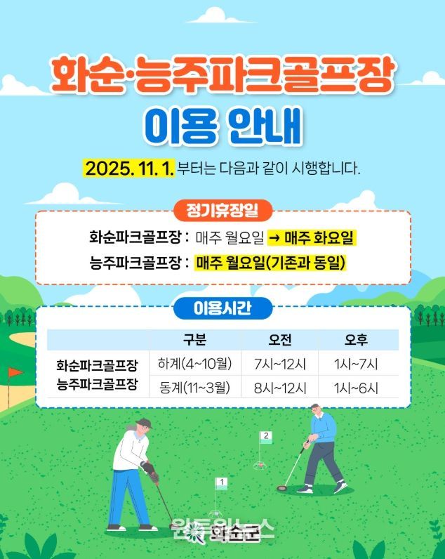 화순군은 화순파크골프장과 능주파크골프장이 매주 월요일 동시에 휴장하던 방식을 변경한다. 화순파크골프장은 매주 화요일에 휴장하고, 능주파크골프장은 기존대로 매주 월요일 휴장한다.