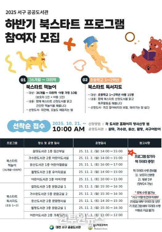 (원투원뉴스) 대전 서구 5개 공공도서관은 영유아의 올바른 독서 습관 형성을 위한 하반기‘북스타트 프로그램’을 운영한다고 14일 전했다.