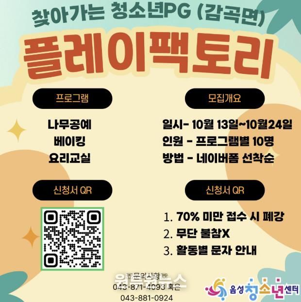 접수는 이달 24일까지 포스터에 있는 QR코드를 통해 선착순으로 진행되며, 찾아가는 청소년 프로그램 특성상 감곡면 거주자를 우선 모집할 예정이다.