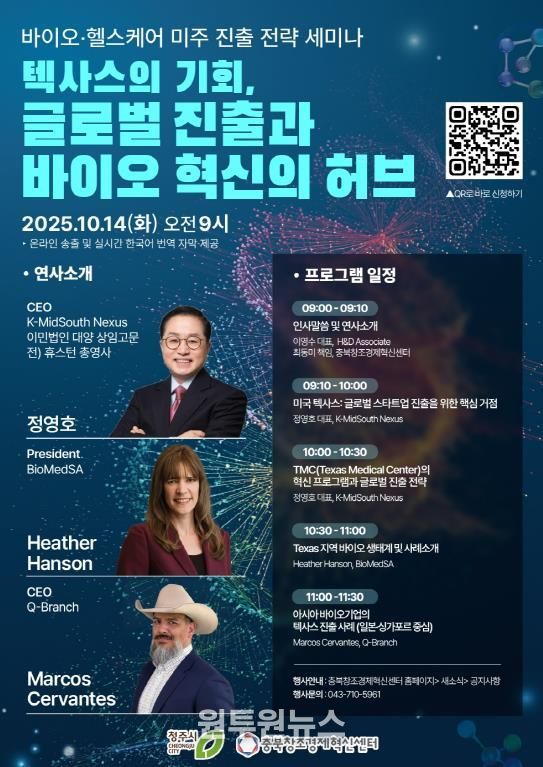 (원투원뉴스) 청주시와 충북창조경제혁신센터는 바이오분야 창업기업의 글로벌 진출을 지원하기 위해 14일 온라인 세미나 ‘텍사스의 기회 : 글로벌 진출과 바이오 혁신의 허브’를 개최했다.