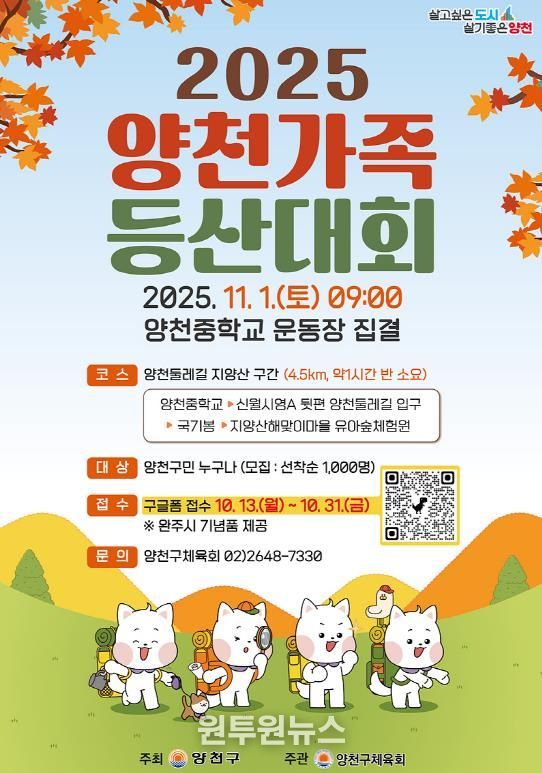 (원투원뉴스) 양천구는 구민의 건강 증진과 건전한 여가 활동을 지원하기 위해 11월 1일 지양산에서 ‘2025 양천가족 등산대회’를 개최한다고 밝혔다.