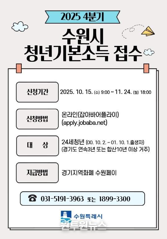 (원투원뉴스) 수원특례시는 10월 15일 오전 9시부터 11월 24일 오후 6시까지 24세 청년을 대상으로 ‘2025년 4분기 청년기본소득’ 신청을 받는다.
