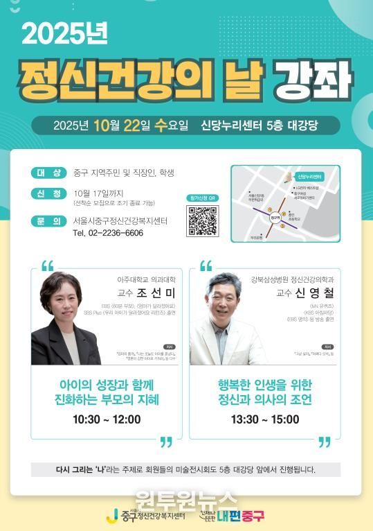 (원투원뉴스) 서울 중구는 오는 22일 신당누리센터 5층 대강당에서 정신건강 강좌를 개최한다. 세계 정신건강의 날(매년 10월 10일)을 기념해 정신건강의 중요성을 알리는 자리로, 중구민과 직장인, 학생, 학부모 등 누구나 참여할 수 있다.
