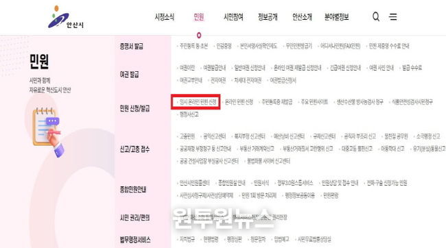 (원투원뉴스) 안산시는 지난 13일부터 ‘국민신문고’ 시스템 장애에 대응해 안산시청 누리집에 ‘임시 온라인 민원 신청’ 창구를 설치하고 운영을 시작했다고 14일 밝혔다.