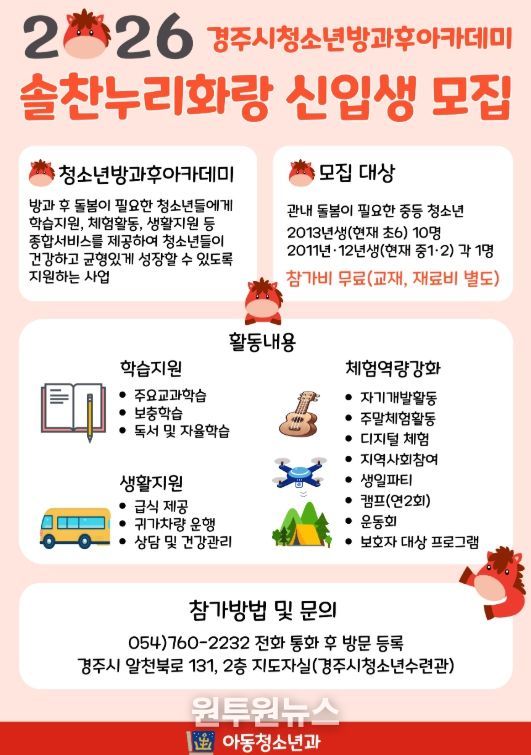 (원투원뉴스) 경주시청소년방과후아카데미 ‘솔찬누리화랑’은 오는 20일부터 2026년도 참가자 12명을 모집한다.