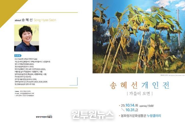 (원투원뉴스) 봉화정자문화생화관은 10월 14일부터 31일까지 누정갤러리에서 송혜선 작가의 개인전 '가을이 오면'을 개최한다.