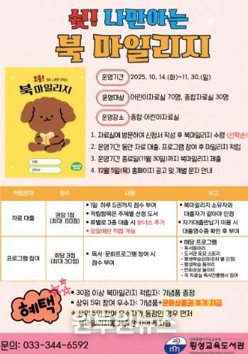 권정애 관장은 “이번 북 마일리지 프로그램을 통해 주민들이 책을 더욱 친근하게 접하고, 아이들부터 어르신까지 책 읽는 기쁨을 나누는 계기가 되길 기대한다”라고 전했다.