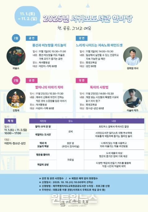 (원투원뉴스) 제주도교육청 서귀포도서관은 11월 1일과 2일 양일간 지역 주민이 함께 즐기는 독서문화 축제 ‘2025년 서귀포도서관 한마당’을 개최한다.
