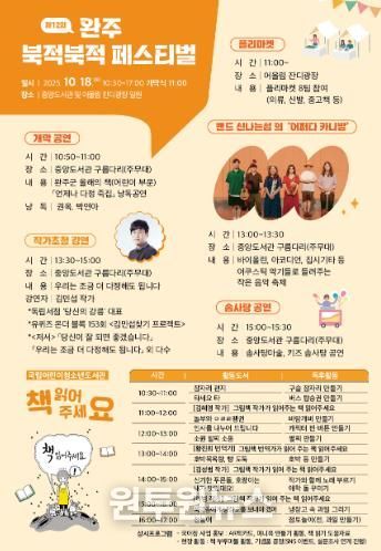 (원투원뉴스) 완주군이 오는 18일 완주군립중앙도서관 일원에서 ‘제12회 북(book)적 북(book)적 페스티벌’을 개최한다.