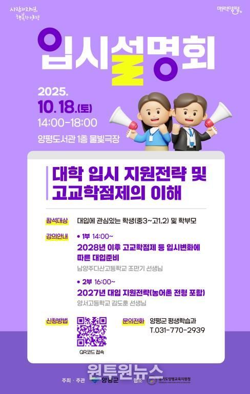 (원투원뉴스) 양평군은 오는 10월 18일 오후 2시, 양평도서관 물빛극장에서 관내 학생과 학부모를 대상으로 ‘2025년 양평군 대학 입시설명회’를 개최한다고 밝혔다. 이번 설명회는 대학 입시에 관심 있는 학생과 학부모에게 다양한 입시 정보를 제공하기 위해 마련됐다.