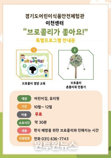 (원투원뉴스) 이천시 어린이식품안전체험관은 오는 10월부터 12월까지 특별프로그램 ‘브로콜리가 좋아요’를 운영한다고 밝혔다.