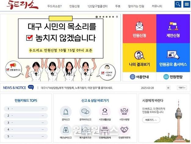 (원투원뉴스) 대구광역시는 9월 26일 발생한 국가정보자원관리원 화재로 ‘국민신문고’와 ‘안전신문고’ 민원 접수가 어려워지자, 자체 민원 시스템인 ‘두드리소’의 민원 신청 기능을 복구해 10월 15일 오전 9시부터 서비스를 재개한다.