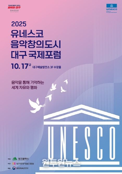 (원투원뉴스) 대구광역시는 오는 10월 17일 대구예술발전소에서 ‘2025 유네스코 음악창의도시 대구국제포럼’을 개최한다.