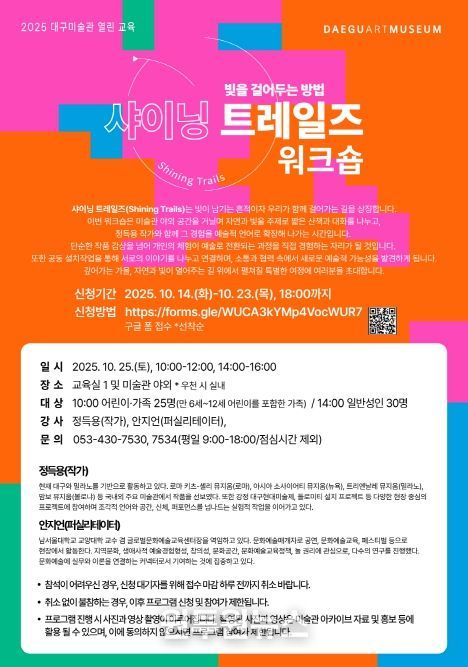 대구미술관 관계자는 “이번 워크숍은 깊어가는 가을, 시민들이 자연과 빛을 매개로 예술적 상상력을 확장하는 특별한 기회가 될 것”이라며, “앞으로도 다양한 작가와 협력해 미술관을 찾는 시민들에게 새로운 경험과 영감을 제공하겠다”고 전했다.