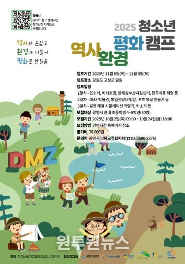 (원투원뉴스) 광명시는 전국남북교류협력지방정부협의회가 주최·주관하는 ‘2025 청소년 역사·평화·환경캠프’에 참가할 청소년을 모집한다.