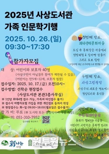 조병길 사상구청장은 “이번 가족 인문학기행은 동화의 시선으로 우리 주변의 자연과 예술을 새롭게 바라보는 뜻깊은 시간이 될 것”이라며, “가족이 함께 이야기를 나누고 상상력을 키우는 하루가 되길 바란다”고 전했다.