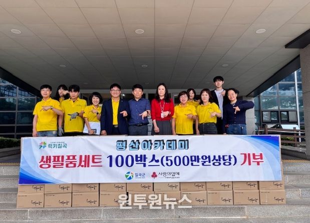 (원투원뉴스) 평산아카데미가 지난 13일 칠곡군청에 생필품세트 100박스(500만원 상당)를 전달했다. 이 생필품박스는 8개 읍면사무소를 통해 관내 저소득 100가구에 전달될 예정이다. 평산아카데미는 동명면 소재의 복합연수원 및 리조트 운영중이며 2019년부터 생필품세트를 기부하고 있으며 누적기부액은 3,215만원에 달한다.