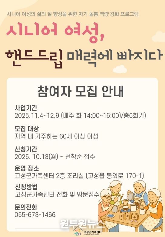 (원투원뉴스) 고성군가족센터(센터장 황순옥)는 지역 내 60세 이상 시니어 여성의 자기 돌봄 역량 강화 프로그램 『시니어 여성, 핸드드립 매력에 빠지다』의 참여자를 모집한다.