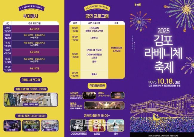 (원투원뉴스) 대한민국의 베니스 ‘라베니체’를 100% 즐길 수 있는 ‘2025 김포 라베니체 축제’가 오는 18일 한강중앙공원과 라베니체 일원에서 열린다. K-드라마 성지이자 대한민국 대표 야간명소로 이름난 라베니체에서 수상버스킹과 불꽃쇼를 동시에 즐길 수 있는 1년에 단 하루 열리는 축제다.