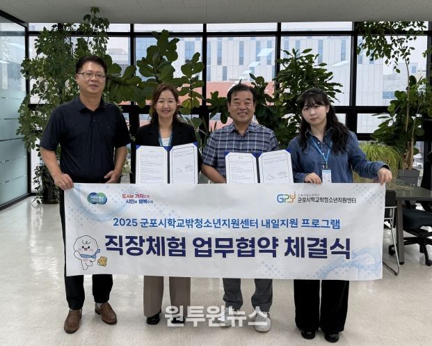 (원투원뉴스) 군포시청소년재단(대표이사 김덕희), 군포시학교밖청소년지원센터(센터장 강연미)는 시각디자인 분야로의 진학과 진로를 희망하는 학교 밖 청소년을 지원하기 위해 관내 디자인 전문업체인 ㈜은진과 직장체험 업무협약을 체결했다고 밝혔다.