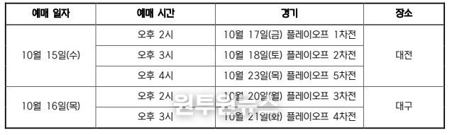 (원투원뉴스) KBO는 10월 17일(금)부터 열리는 삼성 라이온즈와 한화 이글스의 2025 신한 SOL뱅크 KBO 플레이오프 입장권 예매를 10월 15일(수) 오후 2시부터 진행한다.