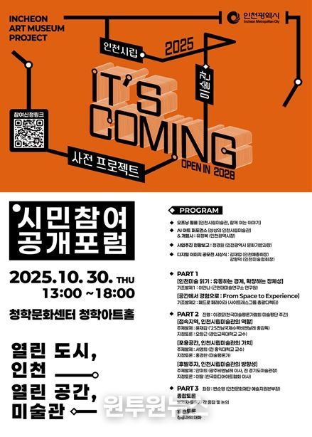 (원투원뉴스) 인천광역시는 오는 10월 30일 오후 1시부터 6시까지 청학문화센터 청학아트홀에서 인천시립미술관 사전프로젝트의 일환인 시민참여 공개포럼을 개최한다고 밝혔다.