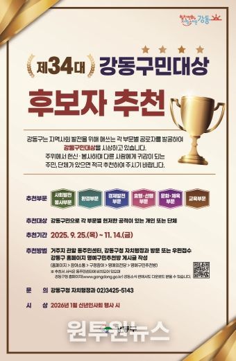 (원투원뉴스) 강동구가 오는 11월 14일(금)까지 지역을 빛낸 ‘제34대 강동구민대상’ 후보자를 공개 모집한다고 15일 밝혔다.