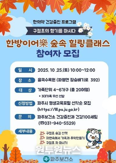 (원투원뉴스) 파주보건소는 시민들의 건강한 삶을 위한 한의약 건강 증진 프로그램인 ‘한방이어락(樂) 숲속 치유교실(힐링 클래스)’을 오는 25일 10시부터 12시까지 율곡수목원에서 운영한다.