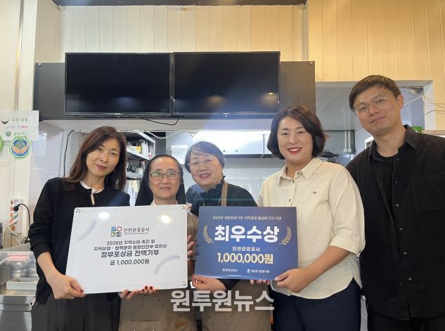 (원투원뉴스) 인천관광공사는 14일‘2025년 지방공공기관 지역경제 활성화 우수사례’행정안전부 장관상(최우수상) 포상금을 경제적으로 어려움을 겪는 지역 청년들을 위해 기부했다.