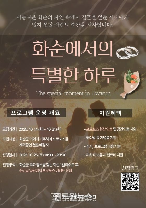 모집은 10월 14일(화)부터 10월 21일(화) 18:00까지로 화순군 외 지역에 거주하며 프로포즈를 계획 중인 커플 1팀을 모집한다. 신청은 별도의 폼 작성을 통한 온라인 접수로 가능하며, 최종선정자는 10월 22일(수) 개별 안내 예정이다.