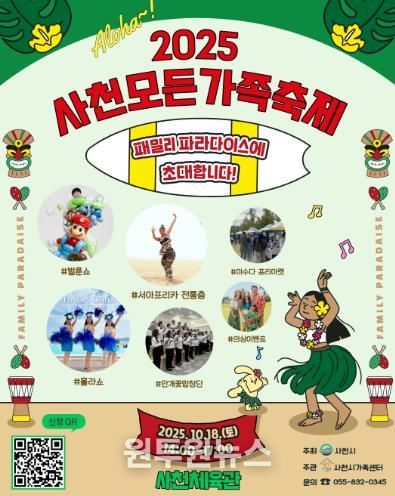 사천시가 주최하고 사천시가족센터가 주관하는 ‘2025 사천모든가족축제’에 대한 자세한 사항은 여성가족과 또는 사천시가족센터로 문의하면 된다.