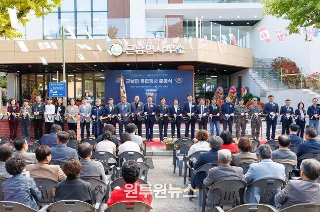 (원투원뉴스) 철원군은 10월 16일, 근남면 육단리 구 청사 옆 부지에서 '근남면 복합청사 준공식'을 개최했다. 이번 행사는 이현종 군수를 비롯해 한종문 군의장, 엄기호 도의원 등 각 기관·사회단체장, 주민 등 100여 명이 참석한 가운데 국민의례, 경과보고, 기념사, 축사, 감사패 전달, 테이프 커팅, 청사 관람 등의 순서로 진행됐다.