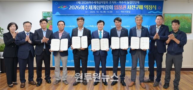 (원투원뉴스) (재)2026여수세계섬박람회조직위원회는 지난 16일 여수시청 시장실에서 여수 농업인 단체와 2026여수세계섬박람회 입장권 1,500만 원 규모의 사전 구매 약정을 체결했다고 밝혔다.