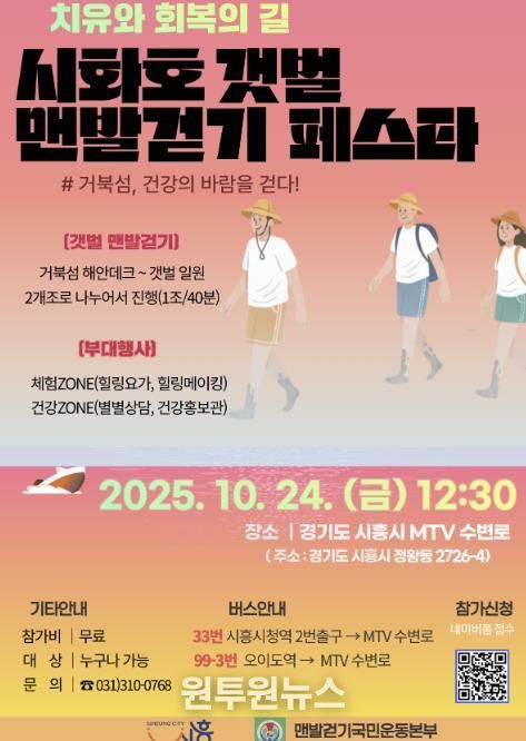 (원투원뉴스) 시흥시는 오는 10월 24일 오후 12시 30분, 거북섬 해안 덱(MTV 수변로)에서 ‘2025 시화호 갯벌 맨발걷기 페스타’를 개최한다.