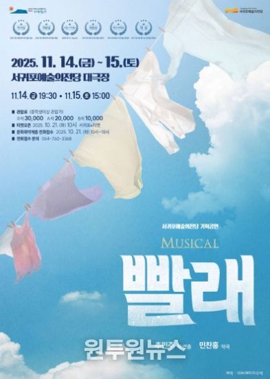 (원투원뉴스) 서귀포예술의전당은 오는 11월 14일 오후 7시 30분, 11월 15일 오후 3시, 이틀간 총 2회에 걸쳐 서귀포예술의전당 대극장에서 뮤지컬‘빨래’를 선보인다.