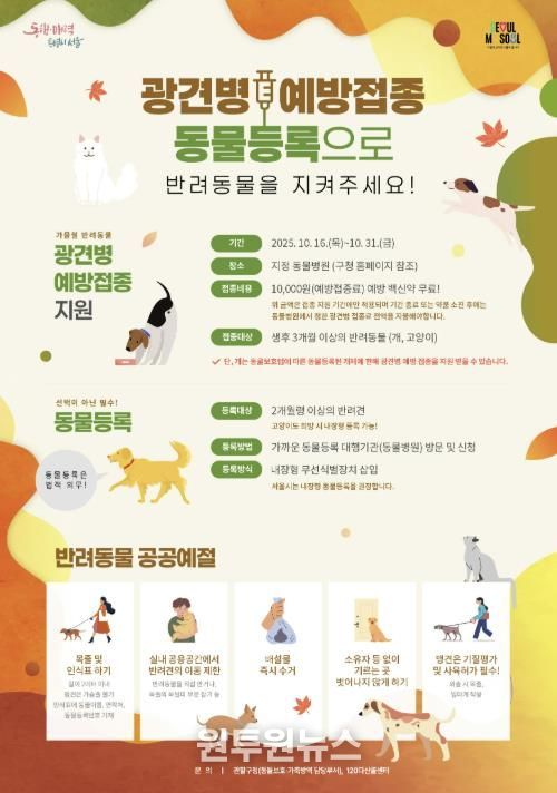 (원투원뉴스) 마포구는 10월 31일까지 광견병 발생 및 확산을 예방하기 위해 관내 40곳 동물병원에서 ‘2025년 가을철 광견병 예방접종’을 실시한다.