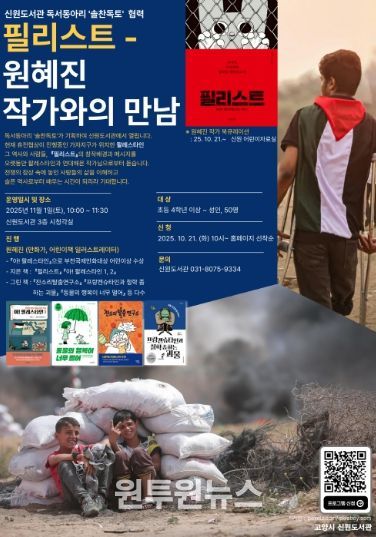 팔레스타인 땅의 역사와 사람들을 다룬 책『아! 팔레스타인』으로 부천국제만화대상 어린이상을 수상한 원혜진 작가는 오랫동안 팔레스타인의 평화를 기원해 왔다. 현재 휴전협상이 진행 중인 팔레스타인 정세에 관한 시의적절한 지식과 작가의 인도적 관점을 엿볼 수 있을 것이다. 특히 이 프로그램은 도서관 독서동아리 ‘솔찬독토’에서 기획, 신원도서관에서 열리게 되어 더욱 뜻깊다.