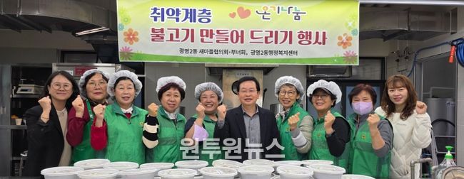 (원투원뉴스) 광명시 광명2동 새마을부녀회는 지난 20일 광명2동 행정복지센터에서 ‘온기 나눔 사랑의 불고기’ 행사를 열었다.