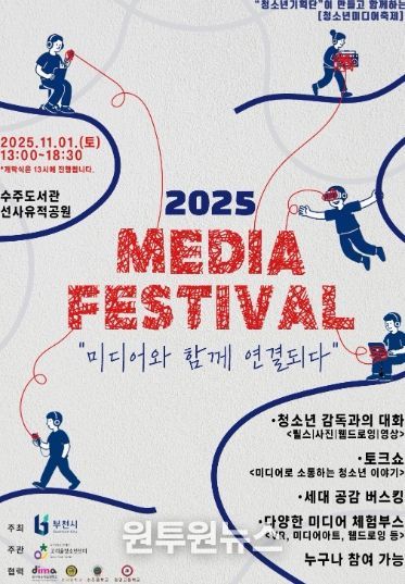 (원투원뉴스) 부천시와 고리울청소년센터가 주관하는 ‘2025 미디어 페스티벌’이 오는 11월 1일 오후 1시부터 6시까지 수주도서관과 선사유적공원에서 개최된다. 이번 축제는 청소년기획단이 주체가되어 직접 기획하고 준비하여 진행하며, ‘미디어와 함께 연결되다’를 주제로, 사람-사람, 사람-기술이 미디어를 통해 함께 소통하고 공감하는 장을 마련했다.