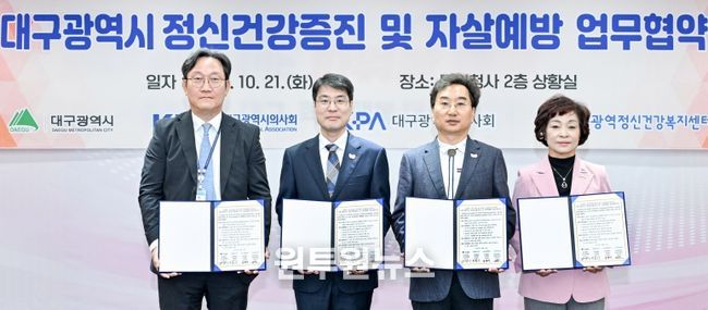(원투원뉴스) 대구광역시는 10월 21일 오전 11시 동인청사 2층 상황실에서 ‘대구광역시 정신건강 증진 및 자살예방 업무협약’을 체결했다. 이번 협약은 대구 시민의 정신건강 증진과 자살 예방을 위한 지역사회 거버넌스 구축을 목표로 한다.