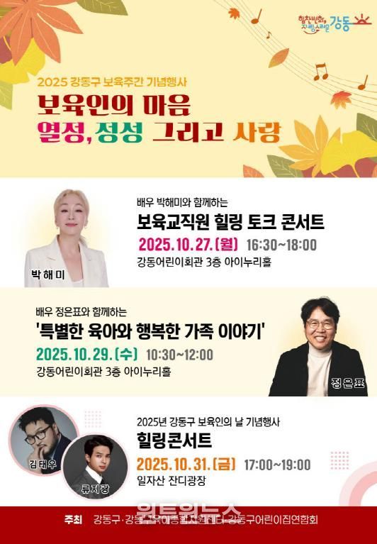(원투원뉴스) 강동구는 10월 보육주간을 맞아 강동구육아종합지원센터와 함께 보육 현장에서 애쓰는 보육교직원을 응원하고, 부모들과 실질적인 육아 경험을 나누는 ‘힐링 토크 콘서트 및 부모특강’을 개최한다고 22일 밝혔다.