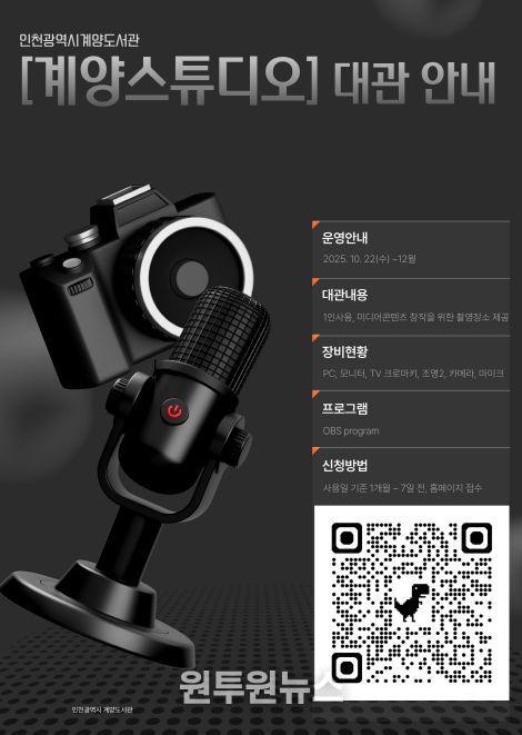 (원투원뉴스) 인천광역시교육청계양도서관은 지역 주민의 창의적 미디어 활동을 지원하기 위해 1층 어린이열람실 일부 공간에‘계양 스튜디오’를 조성하고 10월 22일부터 누리집 및 전화를 통해 무료 대관을 시작한다.