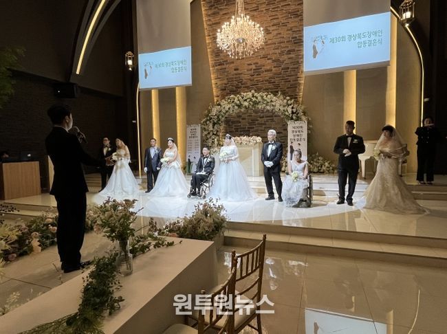 (원투원뉴스) 경상북도는 한국장애인재활협회 경북협회 주관으로 22일 경북 안동 두리원웨딩홀에서 신랑·신부 5쌍과 가족, 친지, 내빈 등 120여 명이 참석한 가운데 ‘제30회 경상북도 장애인 합동결혼식’을 성황리에 개최했다.
