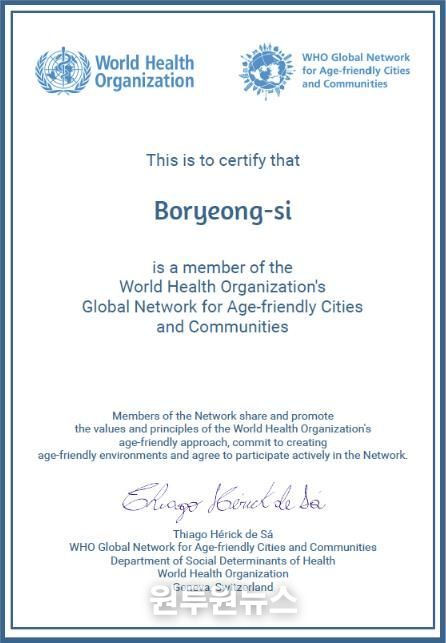 (원투원뉴스) 보령시는 세계보건기구(WHO)가 운영하는 ‘고령친화도시 국제네트워크(Global Network for Age-friendly Cities and Communities)’에 공식 가입하며 고령친화도시로서 국제적 인정을 받았다고 밝혔다.