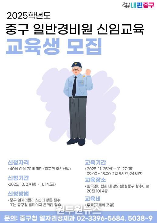 (원투원뉴스) 서울 중구가 법정의무교육 이수부터 취업연계까지 원스톱으로 지원하는 실무 중심의 '일반경비원 신임교육 과정'을 무료로 운영한다.