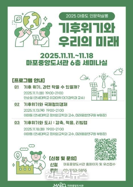 한편 마포중앙도서관에서는 같은 달 11월 11일부터 18일까지 ‘기후 위기와 우리의 미래’를 주제로 ‘하반기 마중도 인문학 살롱’을 운영한다.
