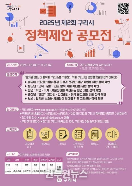 (원투원뉴스) 구리시는 오는 11월 3일부터 11월 23일까지'2025년 제2회 구리시 정책 제안 공모전'을 개최한다고 밝혔다. 이번 공모전의 주제는 ‘구리 시민(영유아·청소년·청년·중장년·노년) 나이별 맞춤형 정책 아이디어’다.
