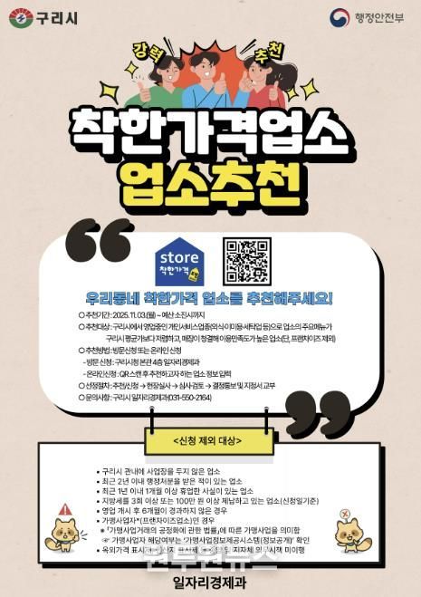 (원투원뉴스) 구리시는 물가 상승 등 어려운 경제 여건 속에서도 저렴한 가격과 친절한 서비스를 제공하는 지역 소상공인을 발굴하기 위해, 11월 3일부터 '우리 동네 착한가격업소를 추천해 주세요' 시민참여 캠페인을 전개한다고 밝혔다.