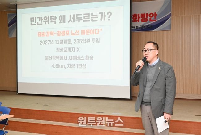 (원투원뉴스) 울산광역시의회 손근호 의원(산업건설위원회)은 3일 오후 의회 3층 회의실에서 진보당과 시민연대와 공동으로 울산의 공공교통 전환 토론회를 개최했다.
